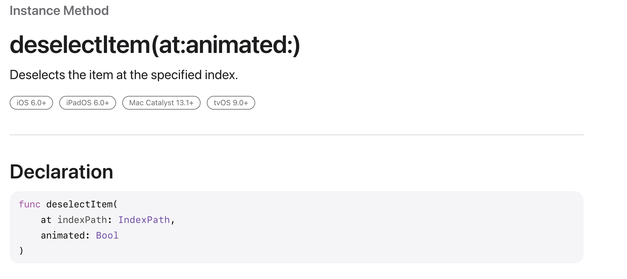 애플 공식문서에 지원하는 메서드를 활용해 보자 설명은 "지정된 인덱스에서 항목을 선택 취소합니다".라고 되어 있다. 실제 적용해 보자. func collectionView(_ collectionView: UICollectionView, didSelectItemAt indexPath: IndexPath) { } 함수에서 아래 코드 추가해준다 self.collectionView.deselectItem(at: indexPath, animated: true) 이렇게 되면 다시 돌아와있을때 선택한 셀에 선택한 효과가 없어져 있다.