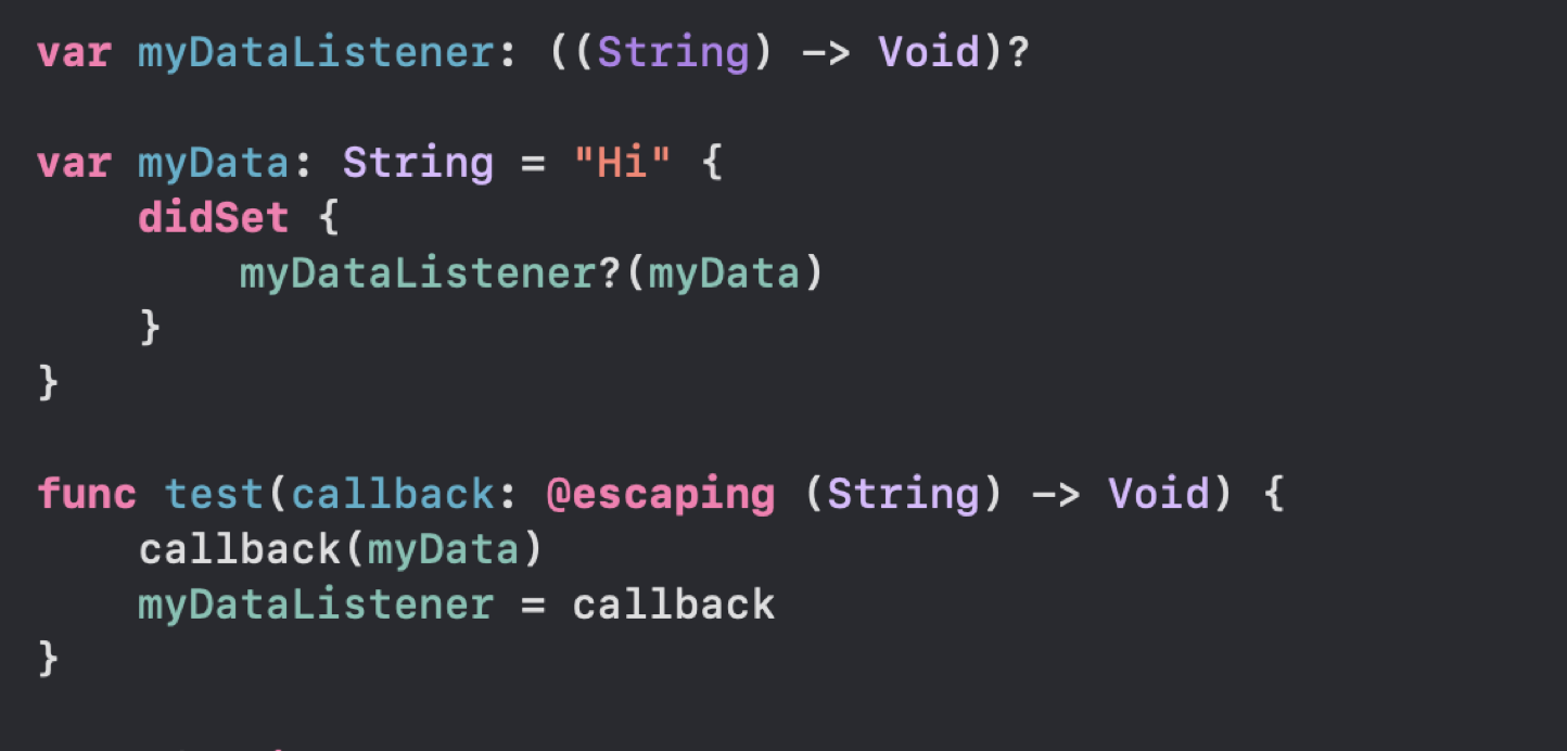 데이터 바인딩을 위한 필요한 것에 대해 생각해 보자 프로퍼티 옵저버를 등록한 저장 프로퍼티 프로퍼티 옵저버에 등록되어 값이 변경될 떄마다 호출될 클로저 프로퍼티 생성 특정 행동에 대한 실행 메소드 선언을 위한 @escaping 클로저 함수 예시 코드 데이터 바인딩 실행 순서에 대해 생각해보자 옵저버 프로퍼티에 선언된 클로저 변수 실행 myData 프로퍼티 값 변경 될 때마다 클로저 변수 실행 Why? 옵저버 프로퍼티에 클로저 변수가 선언되어 있어서 이스케이핑 클로저 함수에서 특정 행동을 등록하면 프로퍼티에 변화가 있을 시 실행 예제 코드에서 print()문을 수행할 것을 등록 @escaping 클로저(callback) 실행 Why? myDataListener가 클로저(callback)를 알고 있어 매개변..