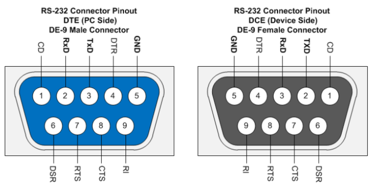 참고로 DB-9 소켓의 RS-232 핀 순서는 male/female 타입에 따라 달라서 주의깊게 봐야합니다. 아래 그림은 DE-9 소켓이지만, DB-9 소켓과 핀 순서는 같고 크기만 다릅니다.